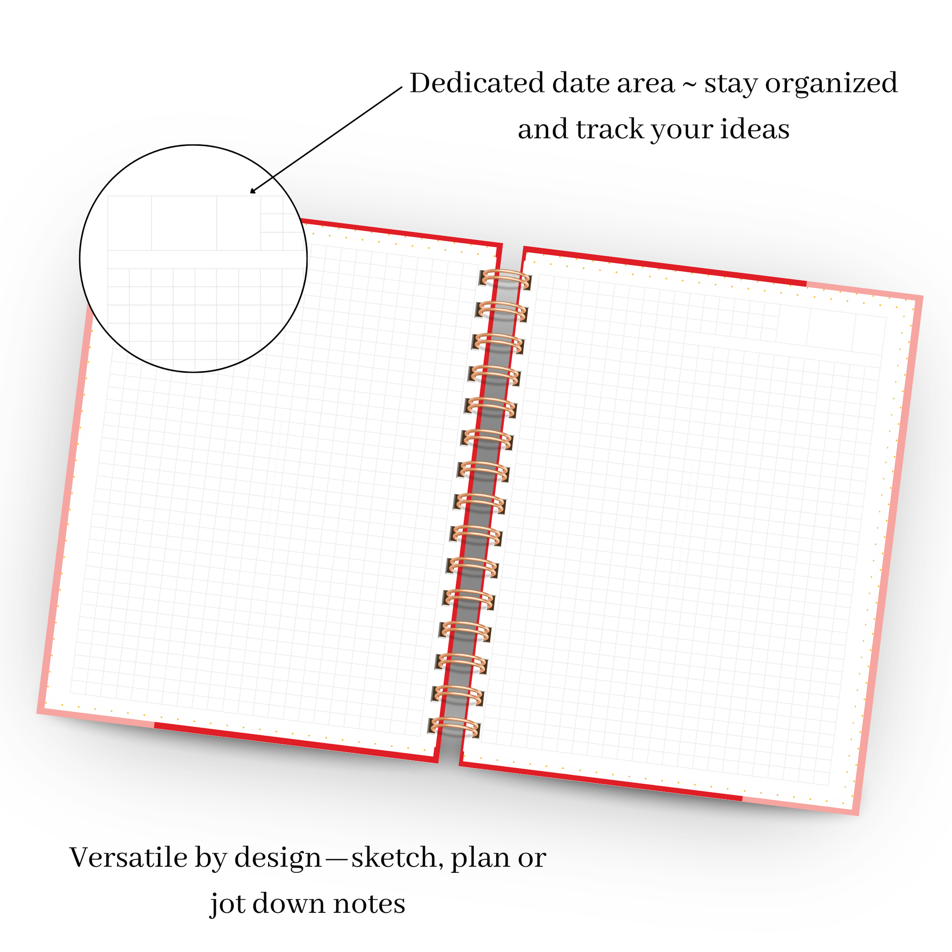 - Grid pages for sketches, goal tracking, bullet journaling, and layouts