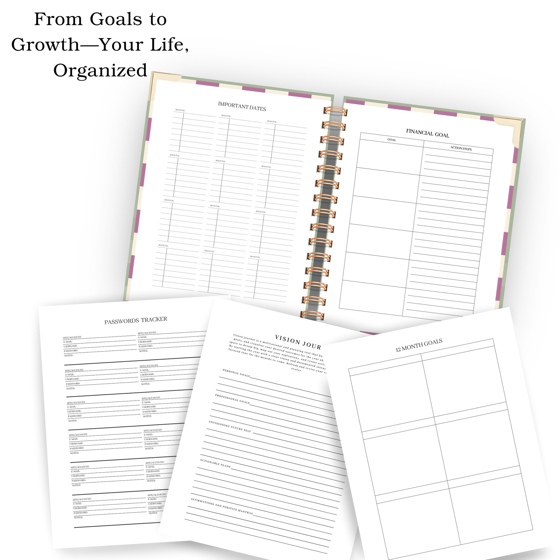 Start anytime and stay on track with the built-in Vision Journal at the beginning and end—perfect for setting intentions and reflecting on progress. A planner that balances life, work, and home in one place.