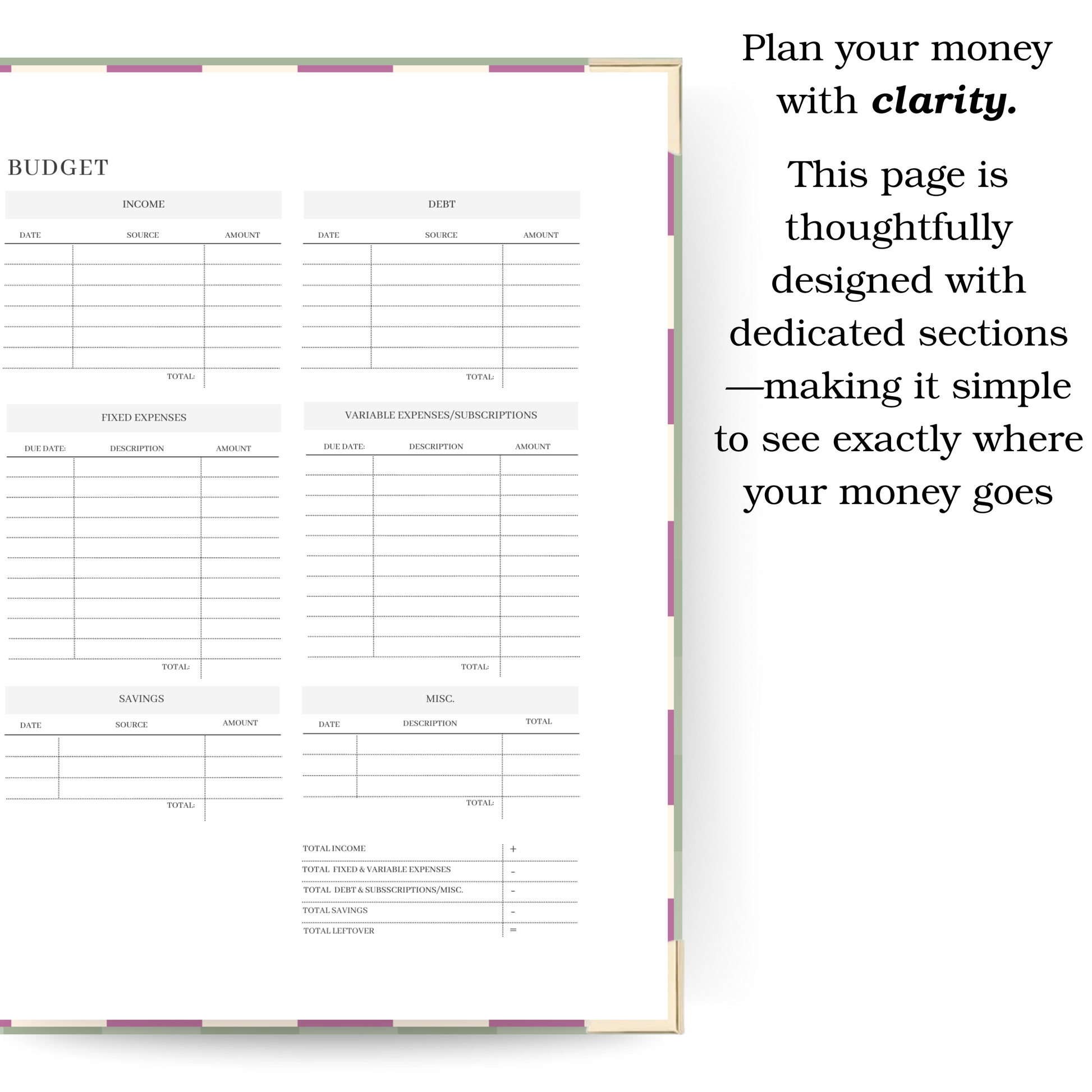Stay organized your way with our versatile undated planner. Featuring weekly layouts (horizontal or vertical), a monthly overview, budget tracker, goals & priorities section, grocery + household list, and next week task space, it’s designed to simplify your planning.
